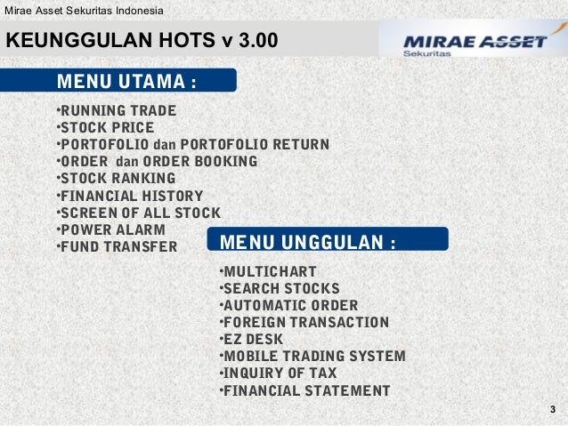Mobile trading system hots adalah home online trading system, yaitu online trading pertama yang aplikasinya disediakan oleh mirae asset sekuritas untuk memfasilitasi kegiatan investasi nasabah di bursa efek indonesia.